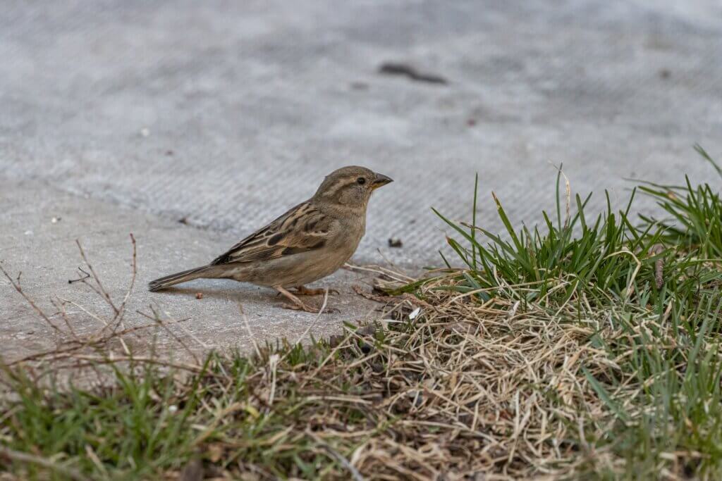 A closeup shot of a house sparrow standing on a concrete ground